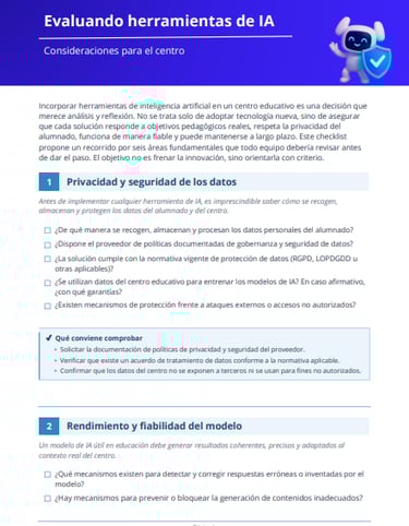 ¿Estáis valorando incorporar una herramienta de IA en vuestro centro? Esta checklist os ayuda a hacerlo con las preguntas adecuadas. Cubre seis áreas clave, desde la privacidad de los datos hasta la formación del equipo, con criterios claros y comprobaciones prácticas para que la decisión sea informada, no improvisada. Pensada para equipos directivos, coordinadores TIC y responsables pedagógicos.