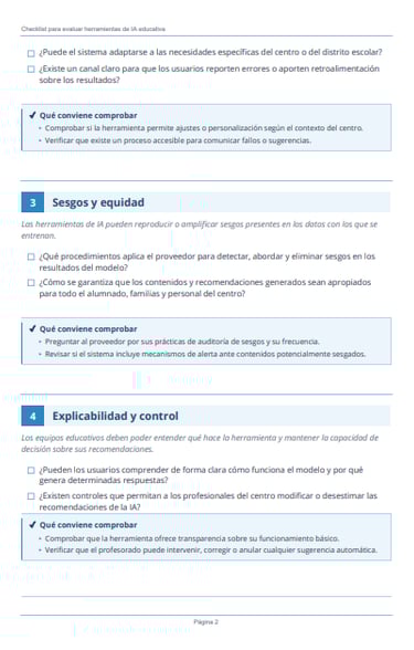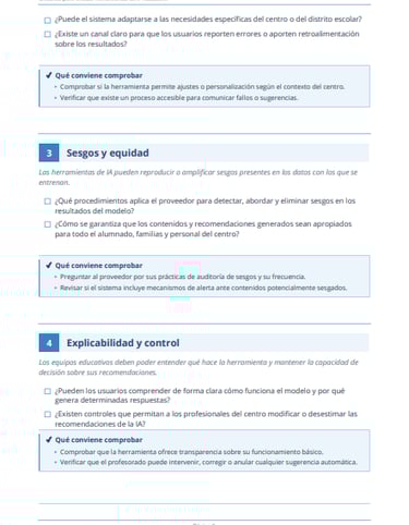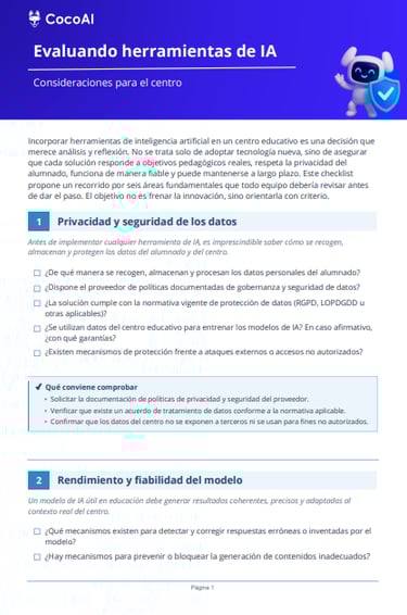 6 áreas clave con preguntas prácticas y comprobaciones accionables para que tu centro tome decisiones informadas antes de adoptar cualquier solución de inteligencia artificial.